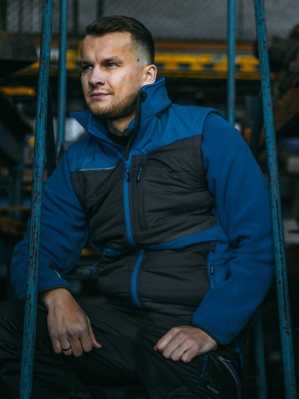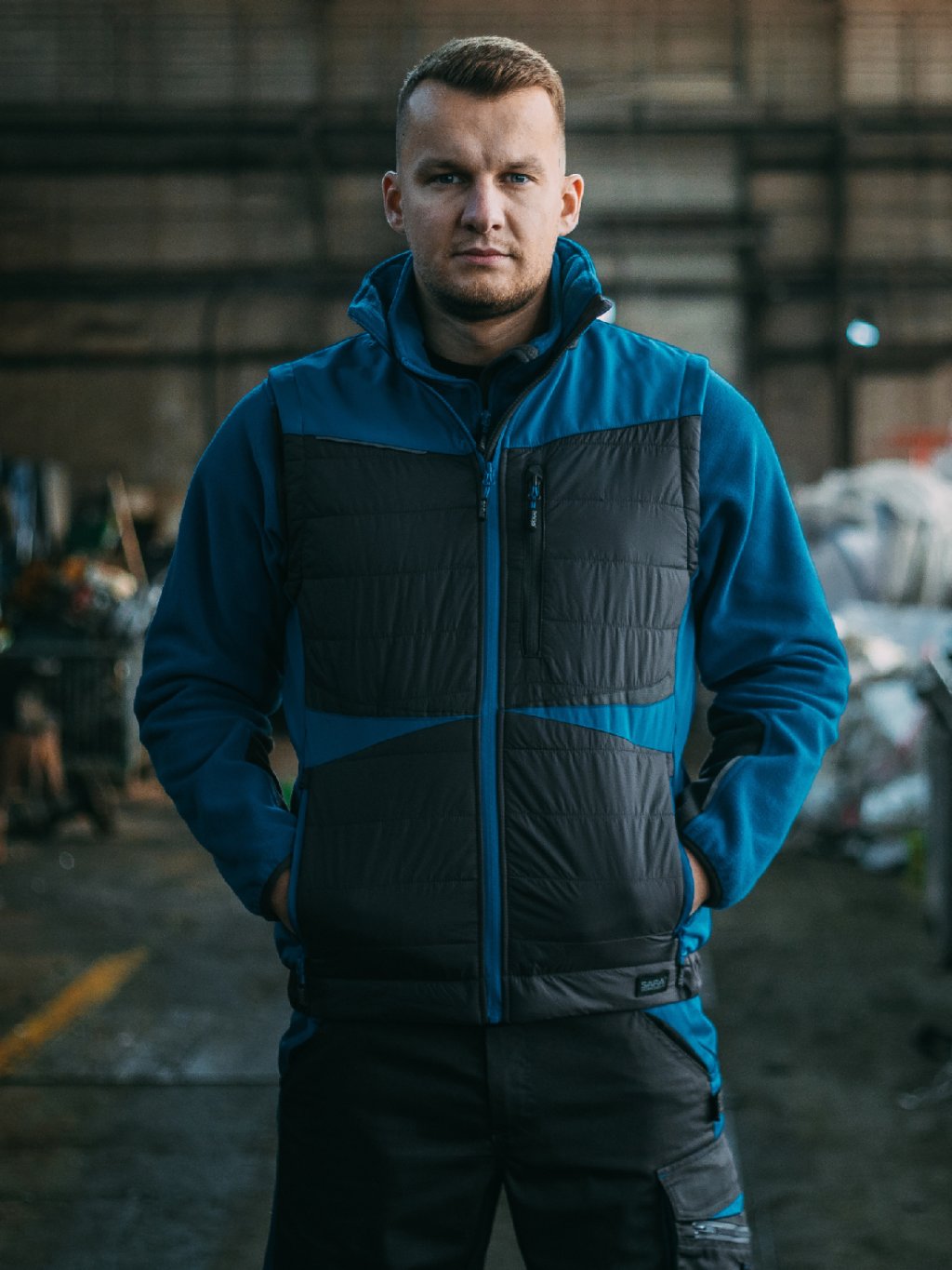 Prošívaná konstrukce poskytuje tepelný komfort, zatímco absence rukávů a elastické vsadky v pase umožňují neomezený pohyb při práci.